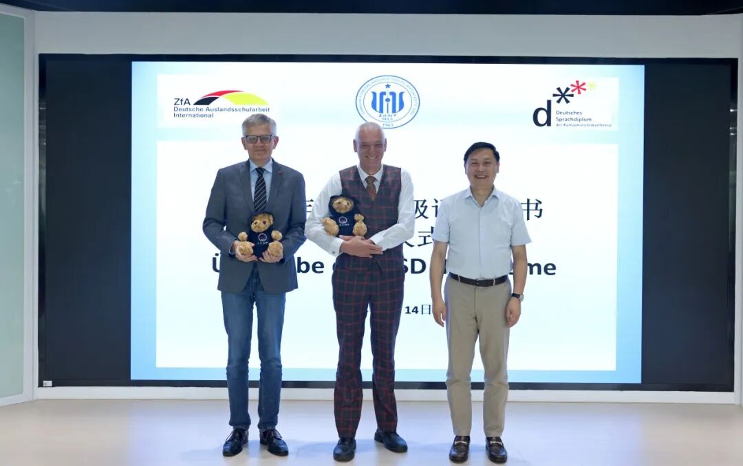 2024年6月14日上午,我校德语组师生齐聚党群服务中心,共同见证德语二级语言证书颁发仪式。德国驻沪总领馆孔有为领事以及吕恩立先生莅临上外附中,为成绩优异的高二学子们颁发证书,杜越华校长和杭虹利副校长代表学校热情接待,外事办、德语组、高二和初二德语学生以及家长代表列席现场。 进入校园,首先由学生代表陪同德国客人参观校史馆,我校德语教学的悠久传统、与德语国家的紧密联系以及在重大外事活动中的专业表现皆通过陈列的展品、文字和图片充分展现,两位学生代表的流利翻译更显上外学子在跨文化交流活动中的从容自信。 学生陪同参观校史馆 移步会场,证书颁发仪式正式开始。杜越华校长首先致辞,他对德语组师生辛勤努力获得的成果表示祝贺,同时对吕恩立先生以及德国驻沪总领馆提供的支持表示感谢。孔有为领事在为附中学子的瞩目成绩所欣喜赞叹的同时,希望同学们不惧挑战,在明年的高考中发挥出卓越的水平。吕恩立先生充分肯定了上外附中的教学质量和附中学子的德语水平,同时强调了他本人与我校的密切联系,希望上外附中在今后继续发挥外语学校的引领示范作用,培养出更多精通德语的学生,自信大方地展示附中学子的外语能力。 杜越华校长致辞 孔有为领事致辞 吕恩立先生致辞 孔有为领事、吕恩立先生、杜越华校长和杭虹利副校长共同颁发德语二级语言证书,同学们的脸上洋溢着喜悦的表情,这一荣誉时刻使其备受鼓舞。 颁发德语二级语言证书 本学期,德语班学生们在各项比赛中均取得优异的成绩。孔有为领事和吕恩立先生亲自为获奖的同学颁发了证书。其中,周乐扬同学在2024青少年德语辩论赛中荣获冠军,并在歌德学院与德国国外学校教育司共同举办的德语奥林匹克比赛中获得二等奖。此外,方焯樱、章楚依和郭中和三位同学在2024年由德国国外学校教育司举办的德语写作大赛脱颖而出,荣获佳绩。 颁发德语奥林匹克获奖证书 颁发写作比赛获奖证书 初二德语班为大家带来德语歌曲表演《奇迹降临》,杜校长向嘉宾赠送学校纪念品,整个德语二级语言证书颁发仪式在友好愉快的氛围中结束。